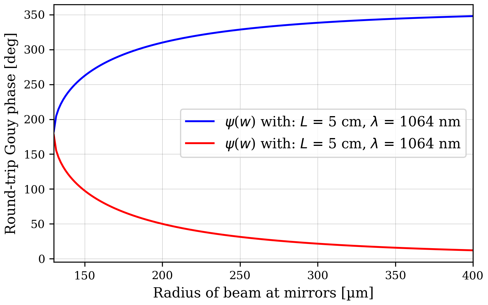 This then computes the round-trip Gouy phase (in degrees) of a symmetric cavity of length 5cm