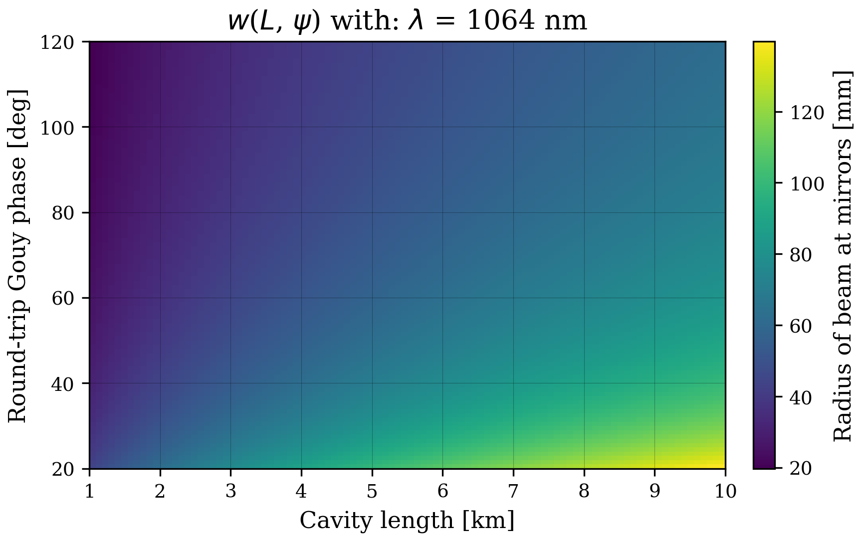 This requests the radius of the beam (in cm) at the waist position of a symmetric cavity of length 10 km given that the round-trip Gouy phase is 145 degrees; resulting in the following output: