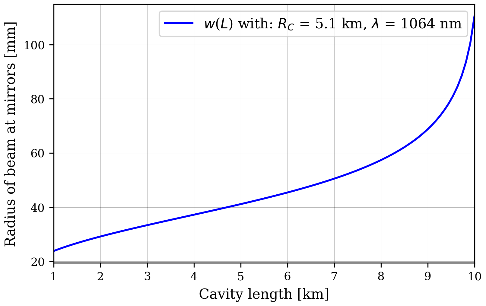This results in a plot (see below) showing how the beam radius at the mirrors of a symmetric cavity varies from a cavity length of 1 km to 10 km with 100 data points, with the radii of curvature of both mirrors fixed at 5.1 km.