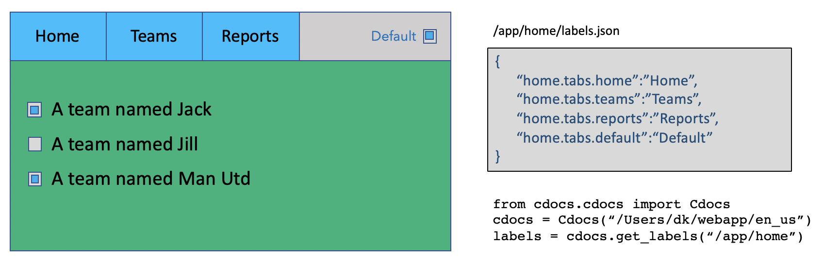 Cdocs can also be used to find text strings referred to as labels. Labels are stored as (non-template) json files containing dict in the same directory tree. The expected use is to find a JSON structure of labels for UI elements that would be seen in the same screen contextual help is available for.