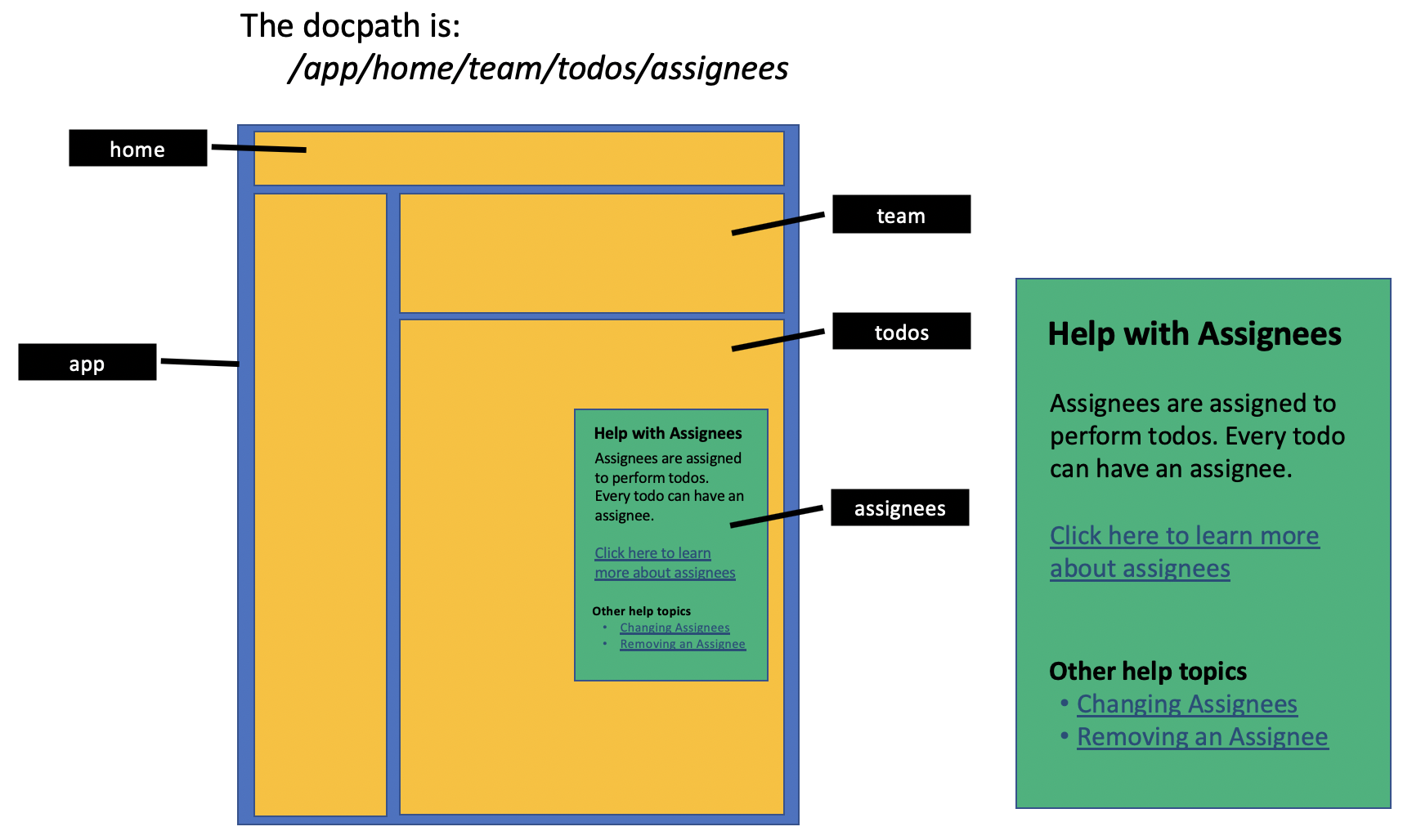 An SPA might use the endpoint to pull docs or labels for context sensitive help, UI labels, internationalization, etc. by converting its router's current route to docpath. A route like /teams/124/projects/15/todos might be converted to /teams/projects/todos to get UI labels and tooltips using something like: