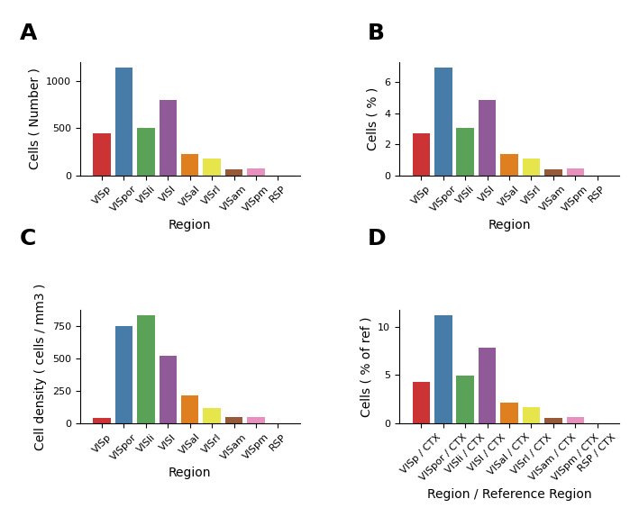 The end result should be bar plots per sample indicating the counts and percentages of cells in each region:
