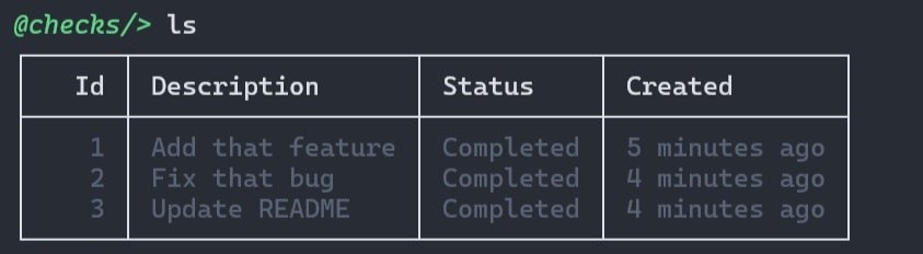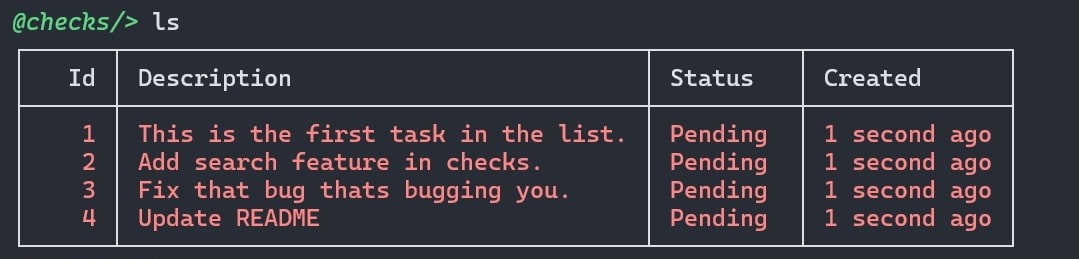 Now that we've added some tasks in our database, let's take a look at them using list or ls command.