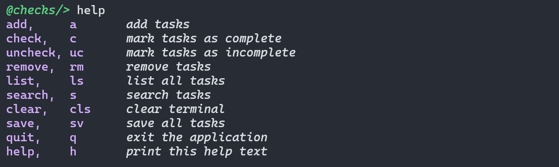 Although checks saves your tasks after each successfull command execution, you can save the database manually just to be on the safe side. Use save or sv to save/write every task from in-memory database to tasks.json.