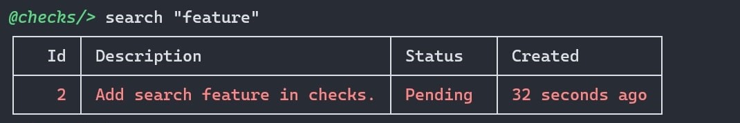 Use search or s command to search for tasks using a query/keyword. (I've added some task in database)