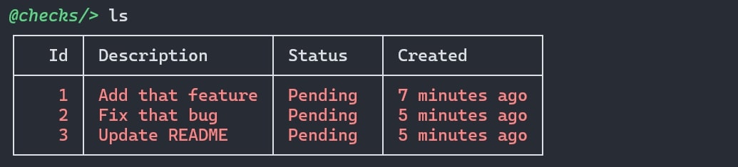 ls alone, shows all tasks and their details. for a more minimal table, use the flag -m or --minimal followed by ls.