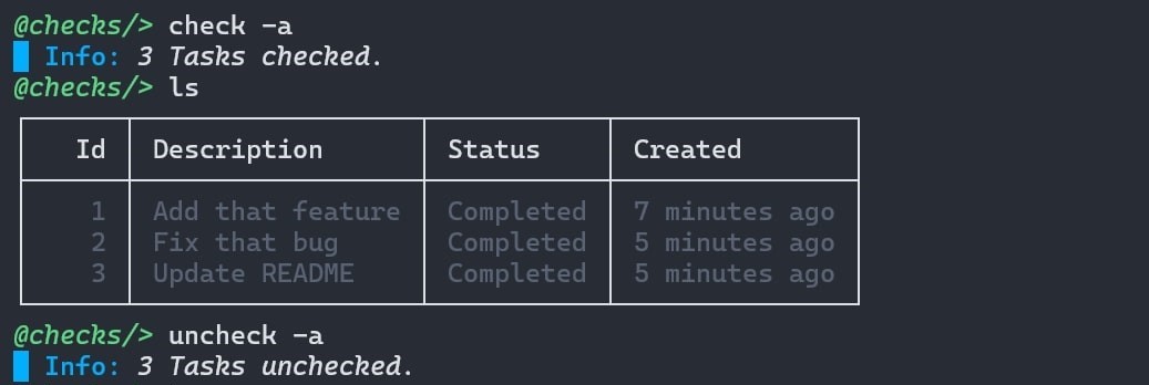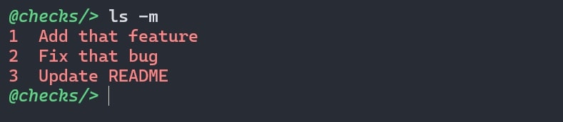Apart from -m flag, ls has two more commands. -c or --completed (which lists only completed tasks) and -p or --pending (which lists only pending tasks).