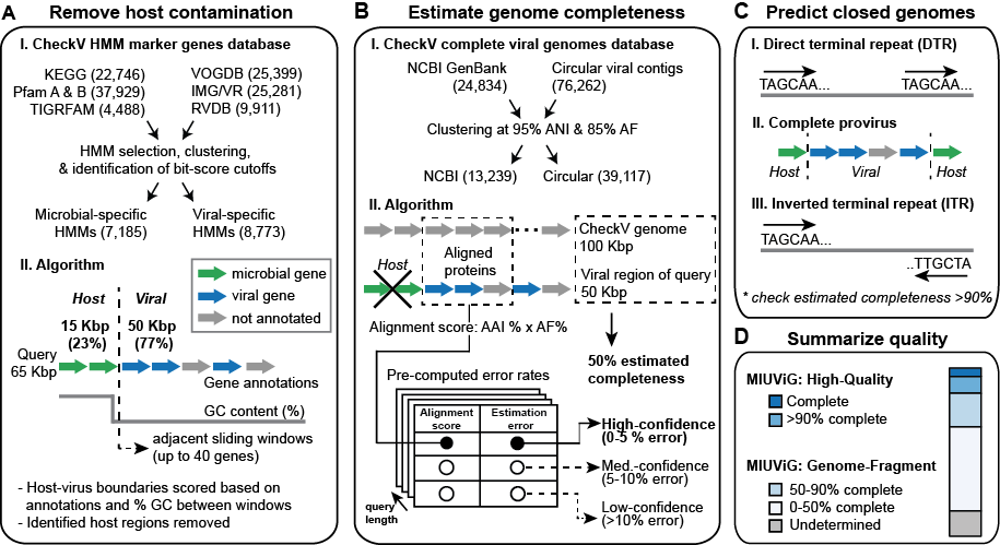 CheckV is a fully automated command-line pipeline for assessing the quality of metagenome-assembled viral genomes, including identification of host contamination for integrated proviruses, estimating completeness for genome fragments, and identification of closed genomes.