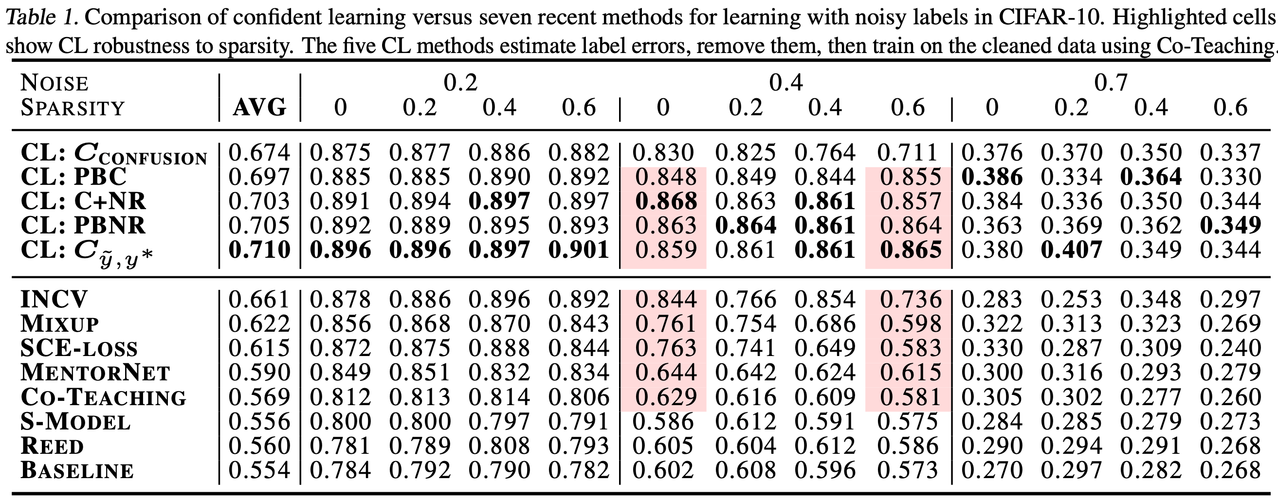 Comparison of confident learning (CL), as implemented in cleanlab, versus seven recent methods for learning with noisy labels in CIFAR-10. Highlighted cells show CL robustness to sparsity. The five CL methods estimate label issues, remove them, then train on the cleaned data using Co-Teaching.