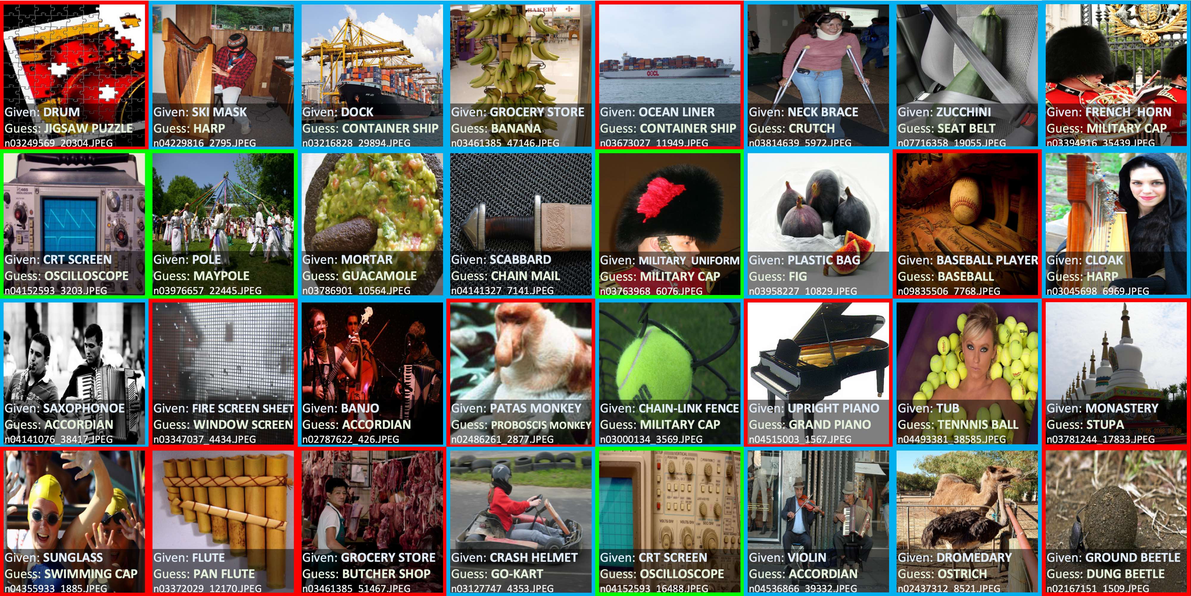 Label issues in ImageNet train set found via cleanlab. Label Errors are boxed in red. Ontological issues in green. Multi-label images in blue.