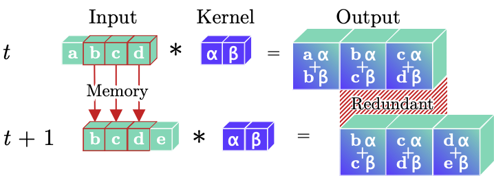 Regular Convolution. A regular temporal convolutional layer leads to redundant computations during online processing of video clips, as illustrated by the repeated convolution of inputs (green b,c,d) with a kernel (blue α,β) in the temporal dimension. Moreover, prior inputs (b,c,d) must be stored between time-steps for online processing tasks.