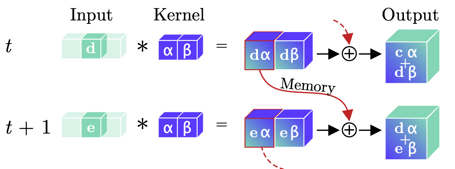 Continual Convolution. An input (green d or e) is convolved with a kernel (blue α, β). The intermediary feature-maps corresponding to all but the last temporal position are stored, while the last feature map and prior memory are summed to produce the resulting output. For a continual stream of inputs, Continual Convolutions produce identical outputs to regular convolutions.