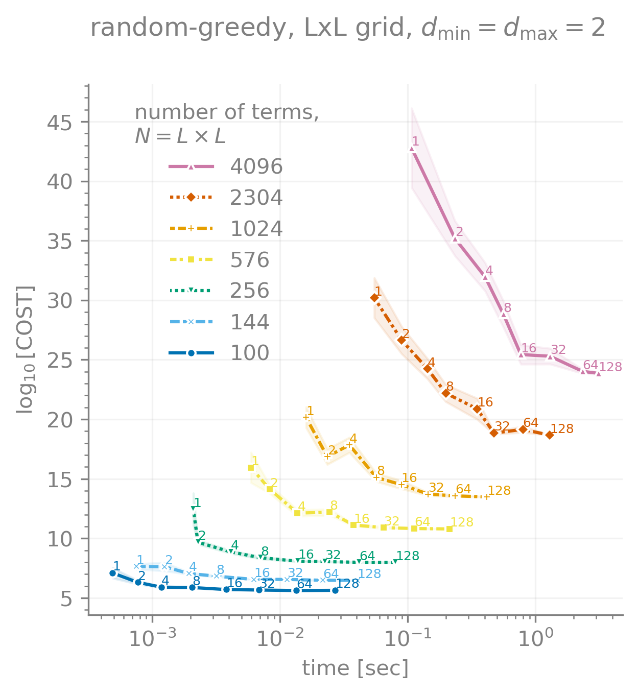 Again, data is taken over 20 runs, with lines and bands showing mean and standard error on the mean. In most cases 32-64 trials is sufficient to achieve close to convergence, but for larger or harder graphs you may need more. The empirical scaling of the random-greedy algorithm is very roughly $\mathcal{O}(N^{1.5})$ here.