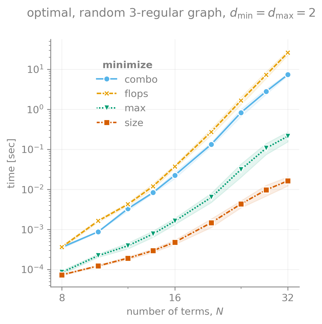 Taken over 20 instances, lines show mean and bands show standard error on mean. Note how much easier it is to find optimal paths for the maximum intermediate size or cost only (vs. total for all contractions). While the runtime generally scales exponentially, for some specific geometries it might reduce to polynomial.