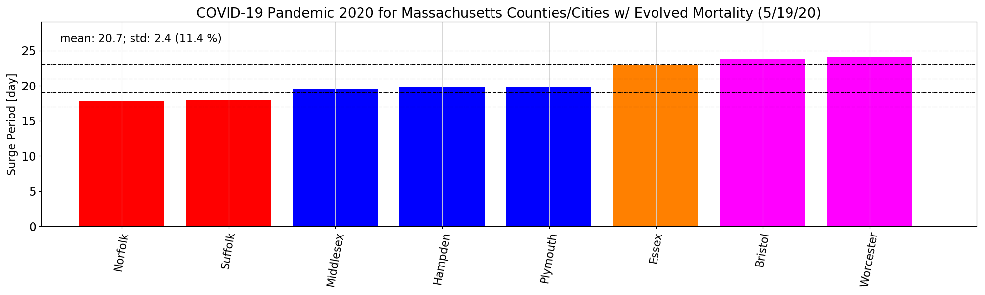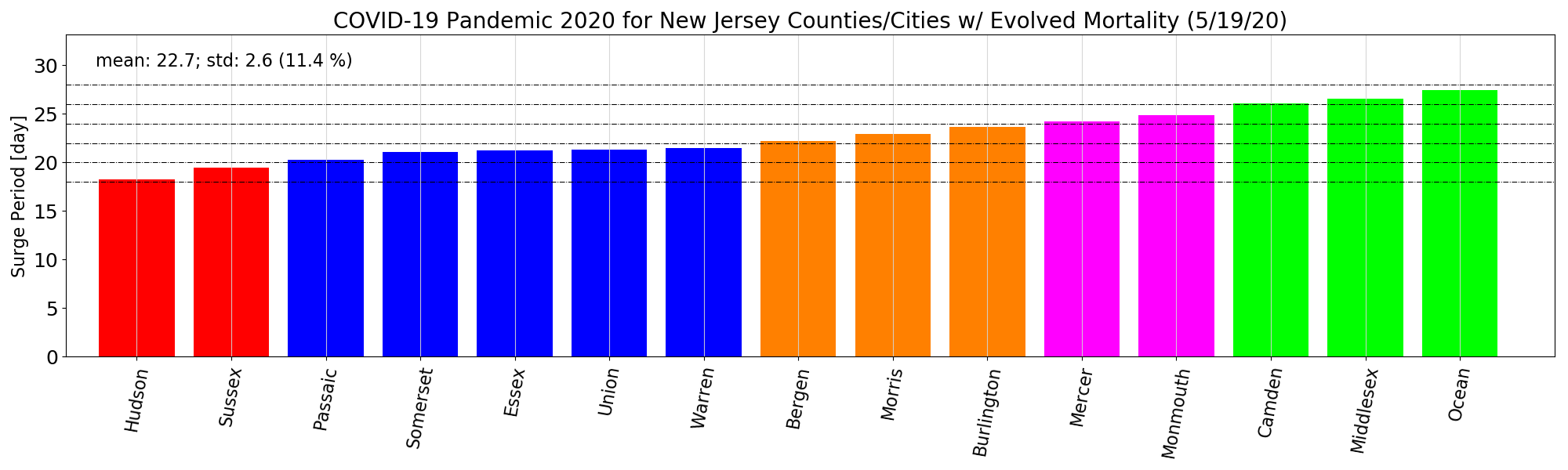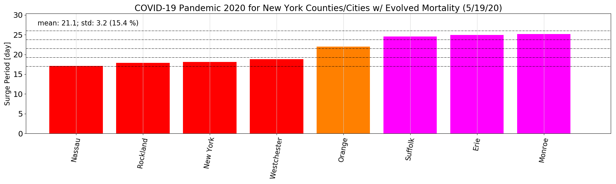 | Distribution of mortality critical surge periods for the US state New York with fully evolved epidemics. The average critical surge period is the number of days between the points of maximum and minimum curvatures on the sigmoid curve approximating the data. Countries to the right are less stressed than countries to the left. The colored bar plot shows locations grouped by 2-day bin widths. |