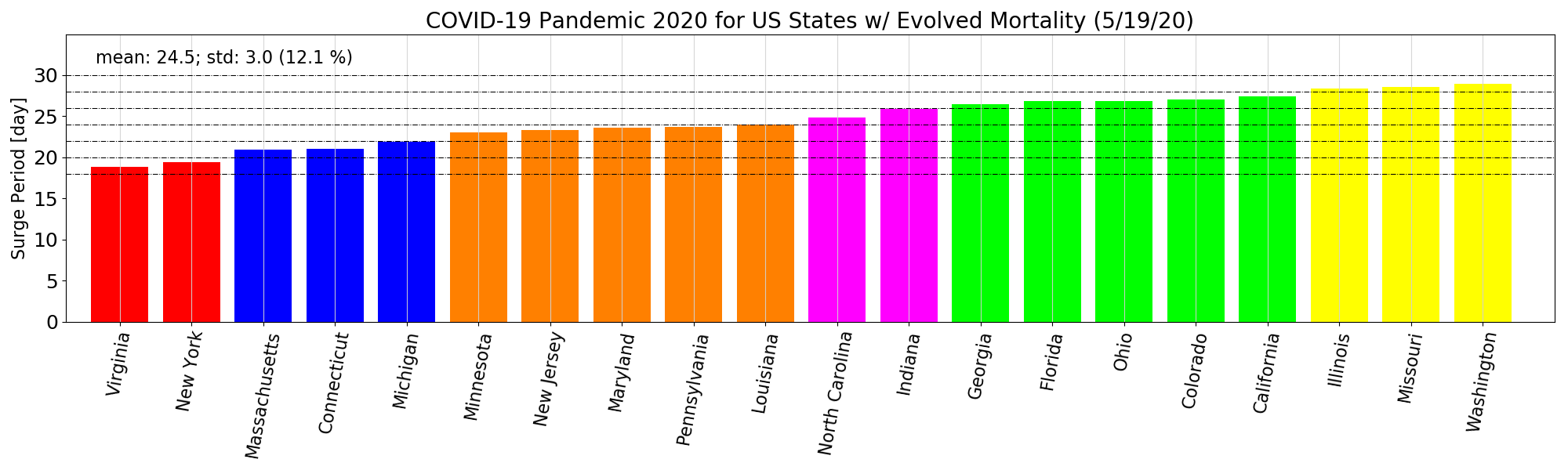 | Distribution of mortality critical surge periods for the US states with fully evolved epidemics. The average critical surge period is the number of days between the points of maximum and minimum curvatures on the sigmoid curve approximating the data. Countries to the right are less stressed than countries to the left. The colored bar plot shows locations grouped by 2-day bin widths. |