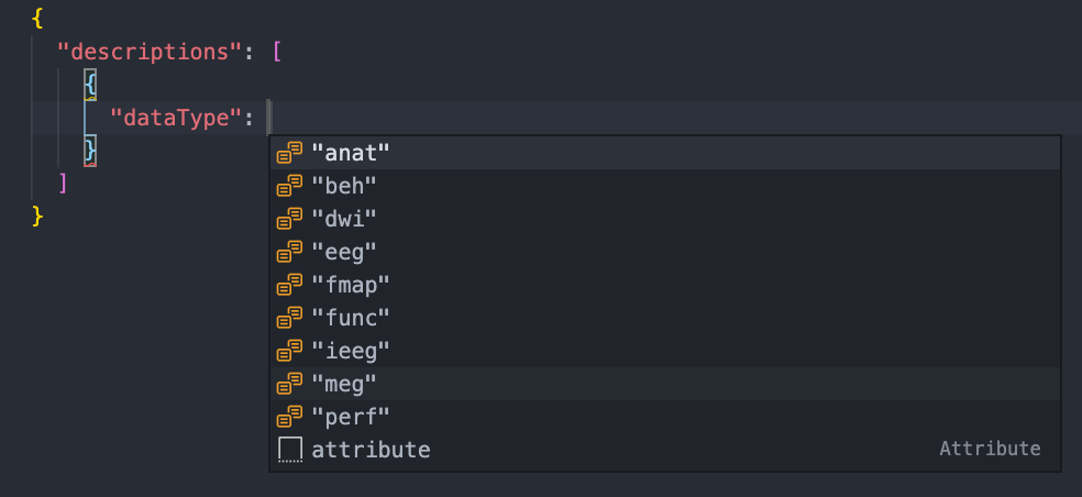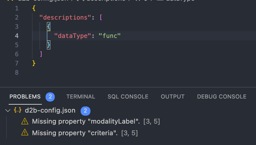 To make writing d2b config files easier, we've included a JSON schema specification file (schema.json). You can use this file in editors that support JSON Schema definitions to provide autocompletion: