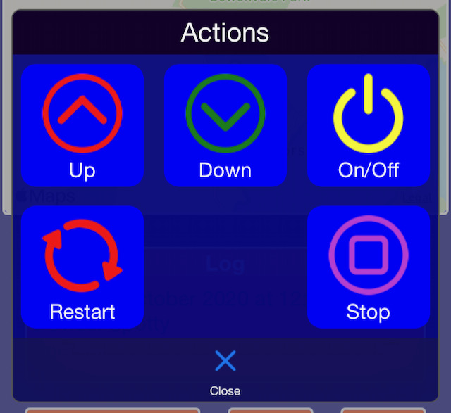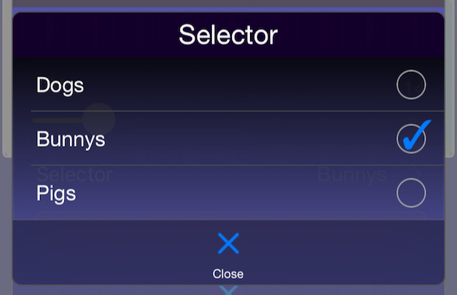 A Selector control is used to present a popup list of options that the user can select from. When a Selector is tapped, the DashIO Dashboard presents the list of text options to the user to make their selection from. The user can tap on an option to select is and the index of the selected option will be sent to the IoT device.