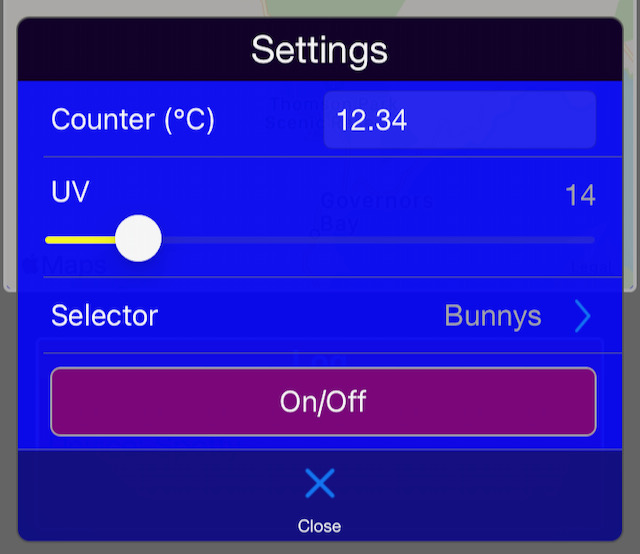 A Menu control is used to present a popup table of user adjustable controls and is ideal for presenting a list of IoT device setup parameters. The Menu does not receive messages directly, but presents a list of other controls (sub-controls) that send and receive messages of their own.
