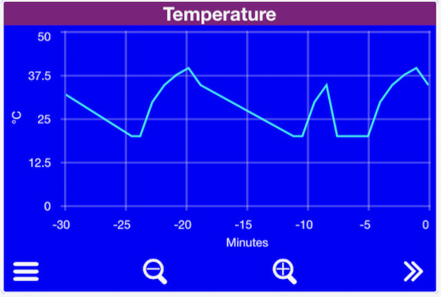 A Time Graph display is used to present time-series graphical data on the DashIO Dashboard, where the data is a series of points containing the time on the horizontal axis and other data on the vertical axis. The IoT device sends messages for each line in the graph. Each message contains one or more data points and the DashIO Dashboard appends the incoming data to create a data series that can be presented, panned and zoomed by the user. The data may be shown as lines, bars or blocked areas.