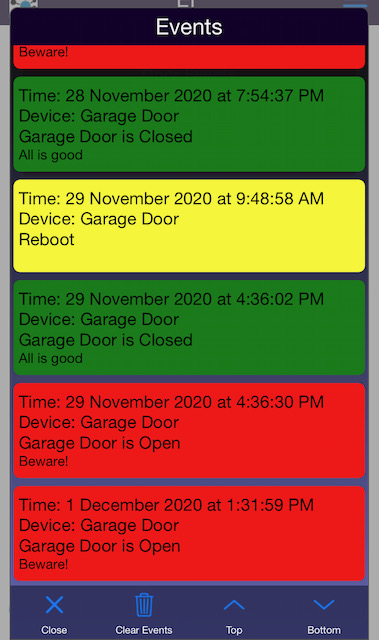 An Event Log display is used to present time stamped events or alarms from IoT devices. The most recent event is shown on the control and a scrollable list of events is presented when the Event Log is tapped by the user.