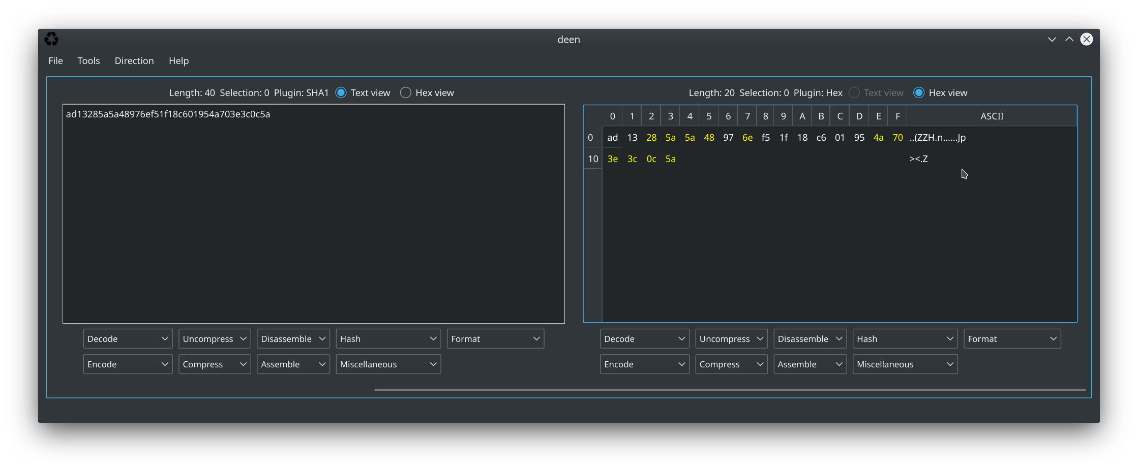 An application that allows to apply encoding, compression and hashing to generic input data. It is meant to be a handy tool for quick encoding/decoding tasks for data to be used in other applications. It aims to be a lightweight alternative to other tools that might take a long time to startup and should not have too many dependencies. It includes a GUI for easy interaction and integration in common workflows as well as a CLI that might be usefule for automation tasks.
