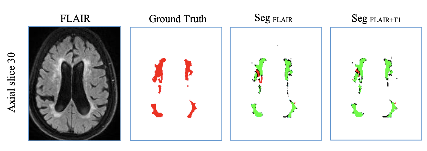 Fig.1: Segmentation result on Singapore 34 [1]. From left to right: FLAIR MR image, the associated ground truth, segmentation result using FLAIR modality only and segmentation result using FLAIR and T1 modalities. In column SegF LAIR and SegF LAIR+T1, the green area is the overlap between the segmentation maps and the ground-truth, the red pixels are the false negatives and the black ones are the false positives.