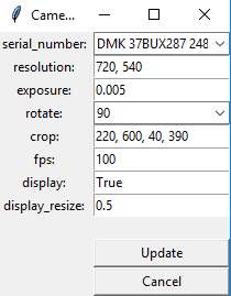 To setup a new camera, select Add Camera from the dropdown menu, and then click Init Cam. This will be bring up a new window where you need to select the type of camera (see Camera Support), input a name for the camera, and click Add Camera. This will initialize a new Camera entry in the drop down menu. Now, select your camera from the dropdown menu and clickEdit Camera Settings to setup your camera settings (i.e. set the serial number, exposure, cropping parameters, etc; the exact settings depend on the specific type of camera). Once you have set the camera settings, click Init Cam to start streaming. To stop streaming data, click Close Camera, and to remove a camera from the dropdown menu, click Remove Camera.