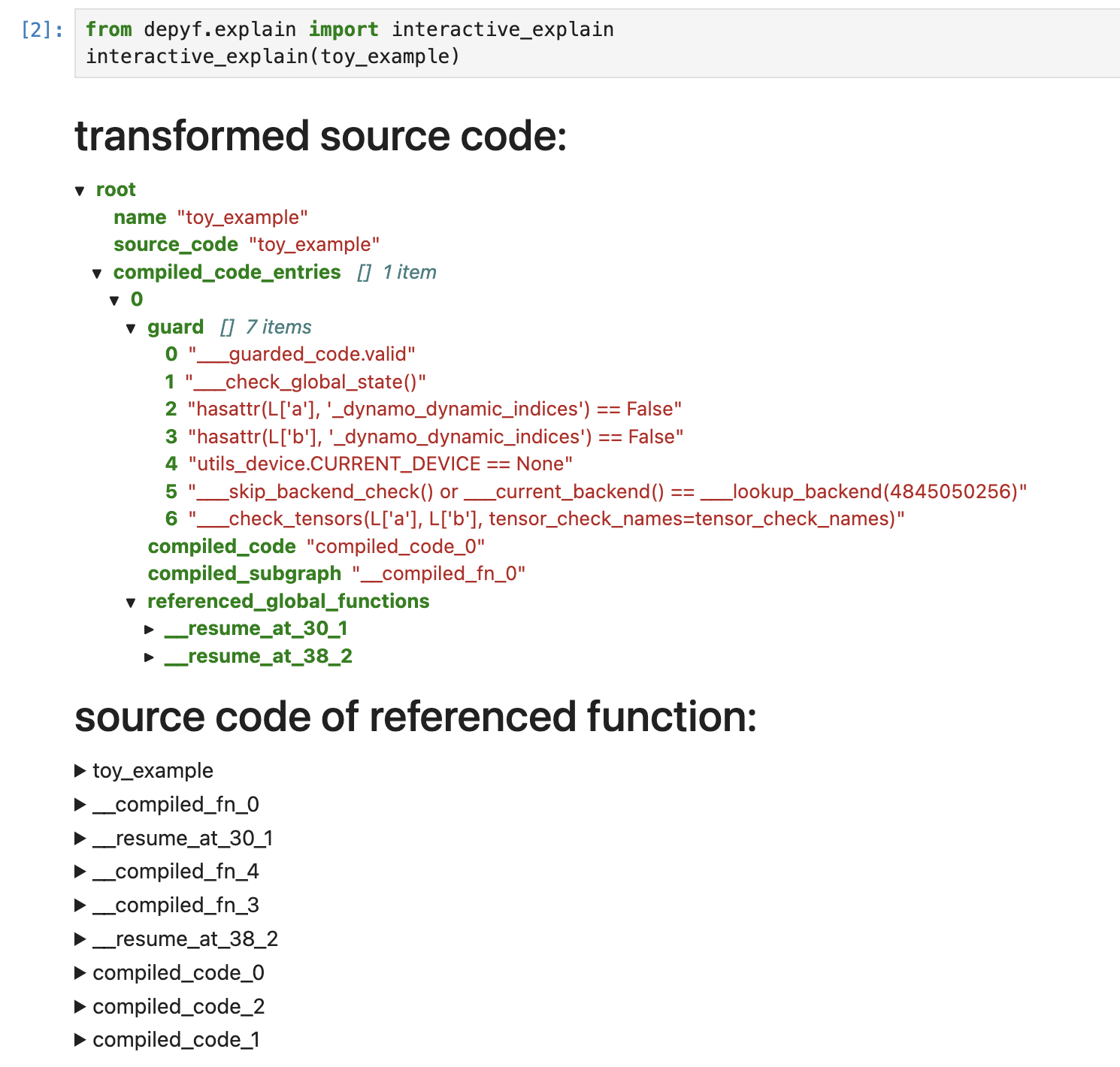 You can explore the code with your favorite IDE. Start from the toy_example function, and pay attention to the compiled_toy_example function below, walk through all the details of guards/compiled code/compiled subgraph/resume functions. It's all in readable source code format!