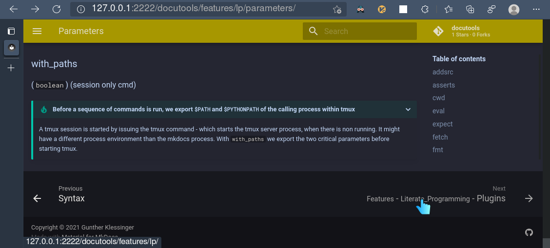 Most notable feature: Literate Programming, i.e. dynamic code execution - tightly integrated within the mkdocs framework.