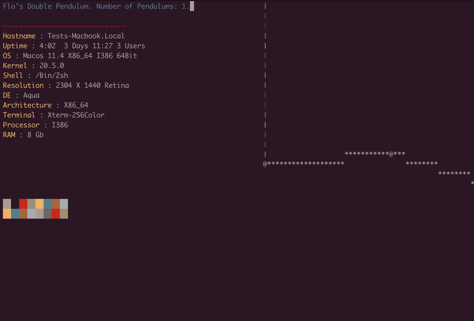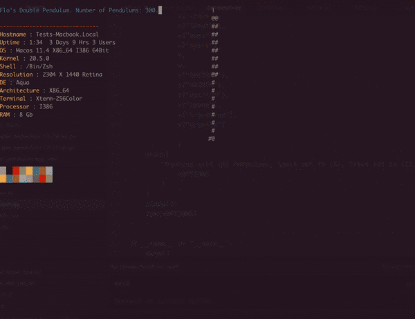A nice relaxing double pendulum simulation using ASCII, able to simulate multiple pendulums at once, and provide tracing of pendulums as well as providing some system information. If you spot any bugs or features that need adding (especially with the specs), just open an issue :)