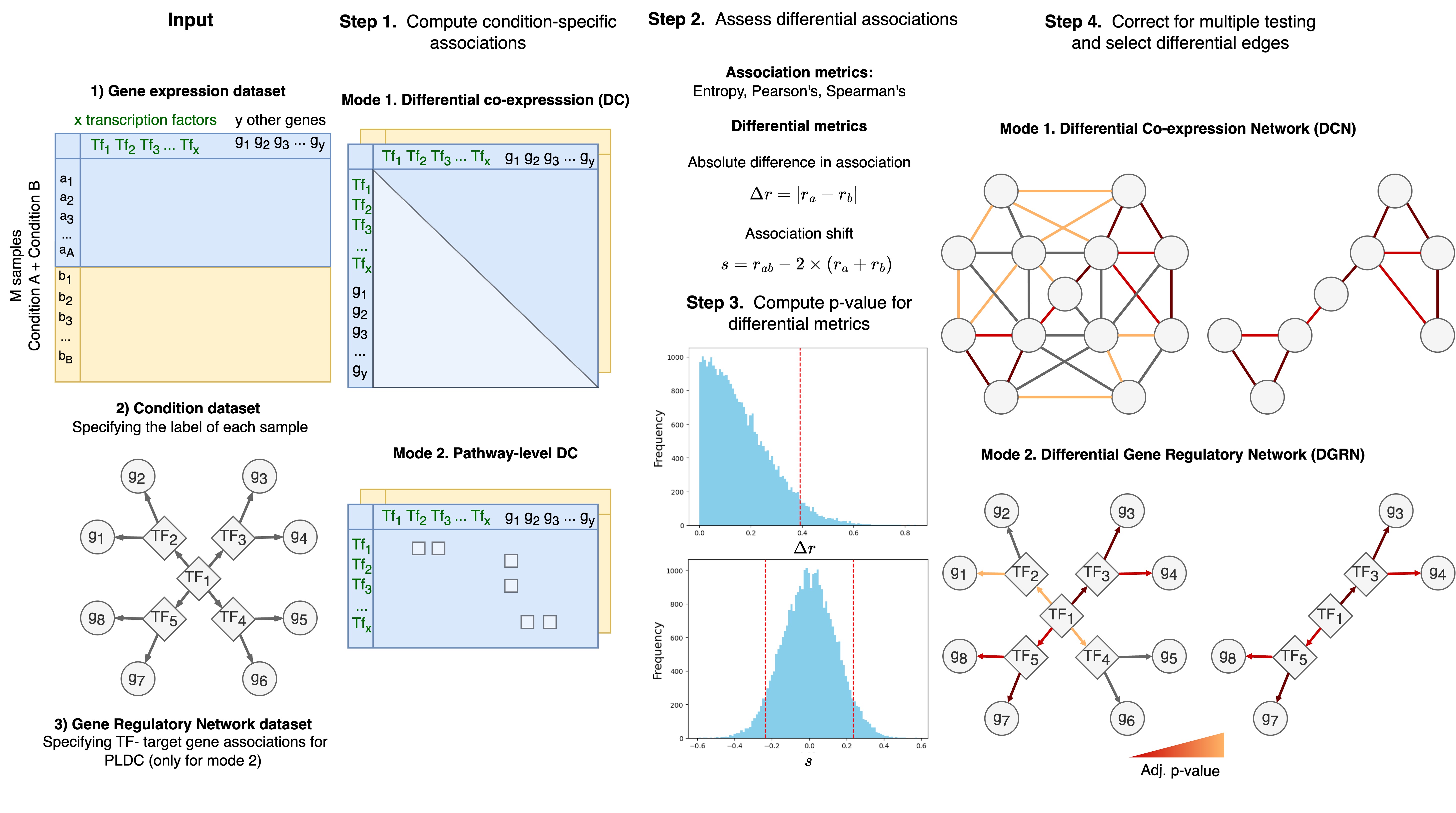 DRaCOoN assesses the change in condition-specific correlations between pairs of genes. It utilizes different association metrics like, Pearson's r and Spearman's ρ correlation coefficients or an entropy-based metric. Then it computes differential metrics based on these values.