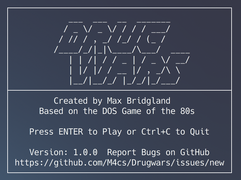 Drugwars is a game I've been playing for a long time, well before I learned how to program. Now that I'm apt in Python I thought what the hell, why not rewrite a game I love in Python and release it. Well that's what I'm doing and here it is. Enjoy :)