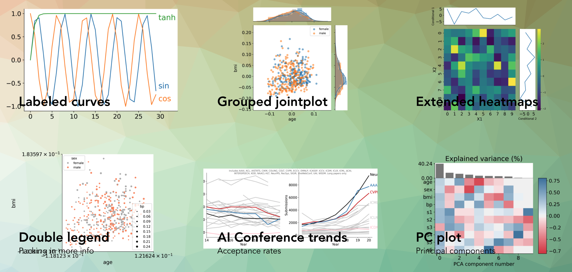 One particularly useful function is dvu.line_legend() which replaces a typical matplotlib legend with labels for each line: