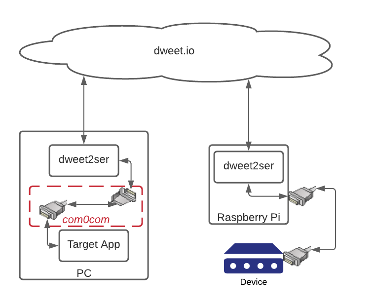 In the above example, we could use com0com to create a virtual null modem with ports COM20 and COM21. dweet2ser would connect to COM20, and the PC software to COM21.
