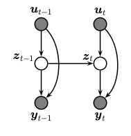 $$p(y_{1:T}, z_{1:T} \mid u_{1:T}) = p(z_1 \mid u_1) \prod_{t=2}^T p(z_t \mid z_{t-1}, u_t) \prod_{t=1}^T p(y_t \mid z_t, u_t)$$