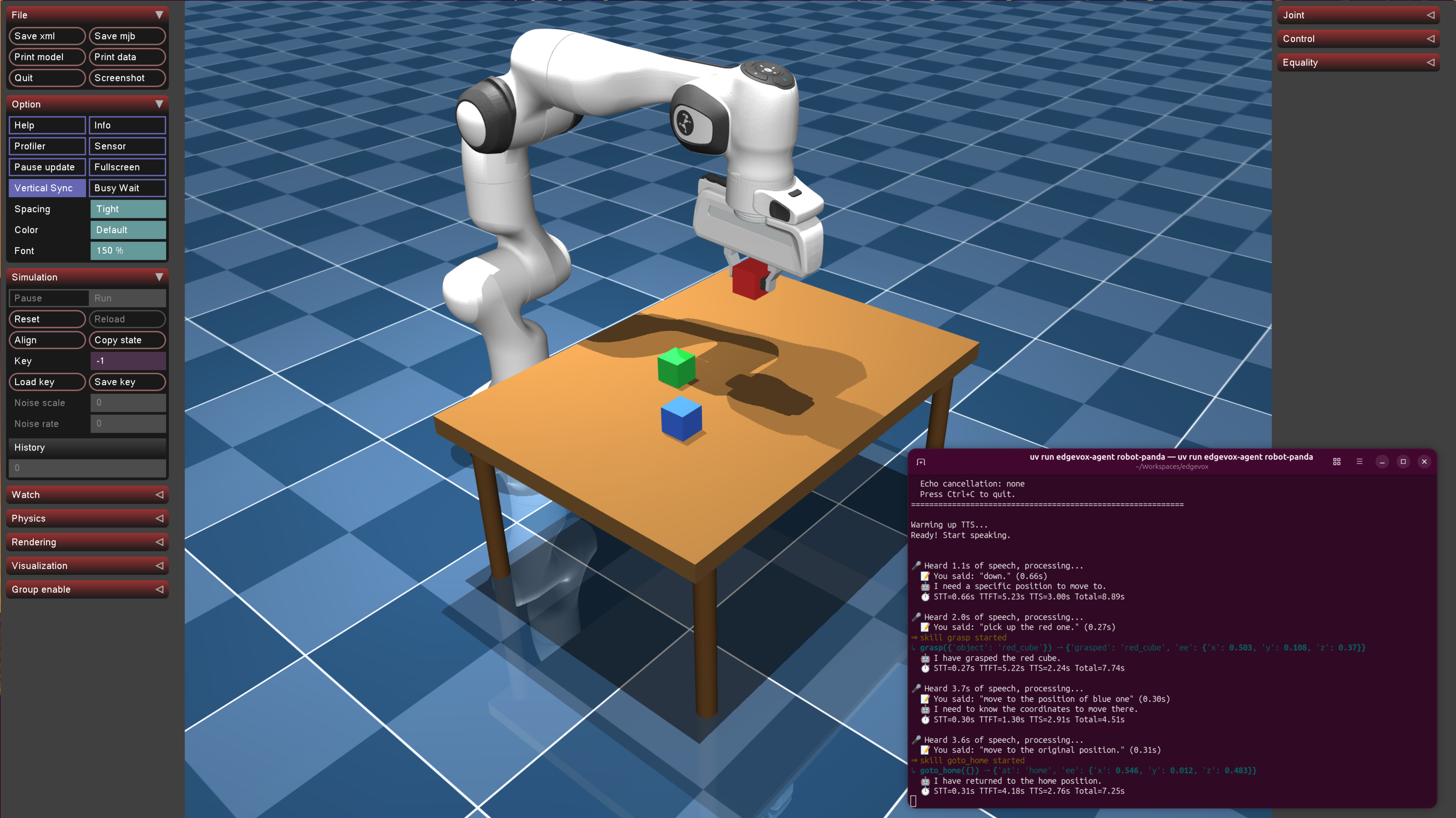 A MuJoCo viewer opens with a Franka Panda arm above a table with three colored cubes. Type "pick up the red cube" — the arm moves, grasps, and lifts. Voice commands control move_to, grasp, release, and goto_home skills.