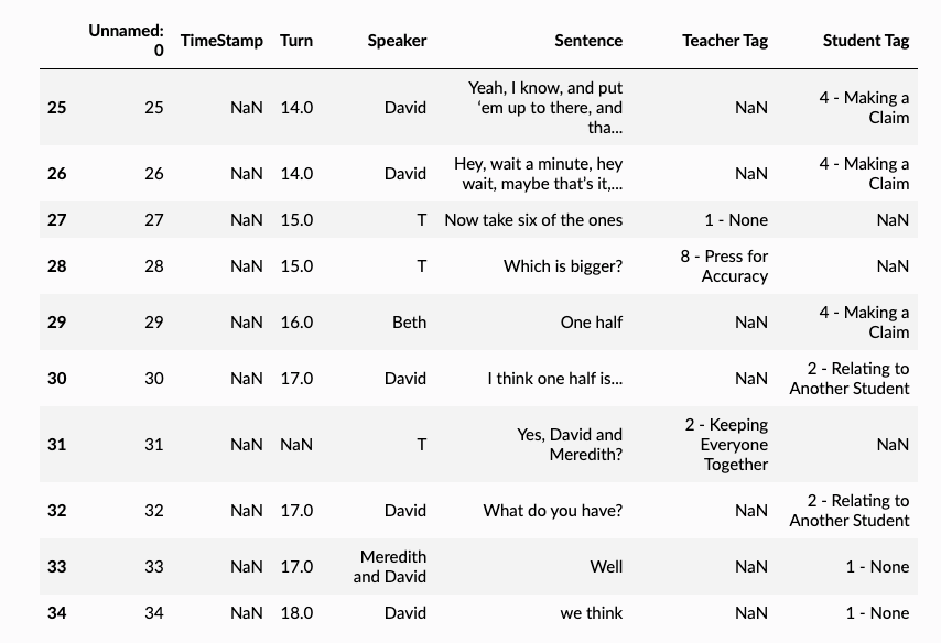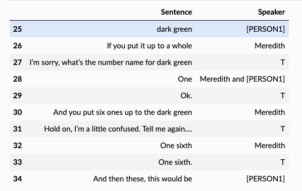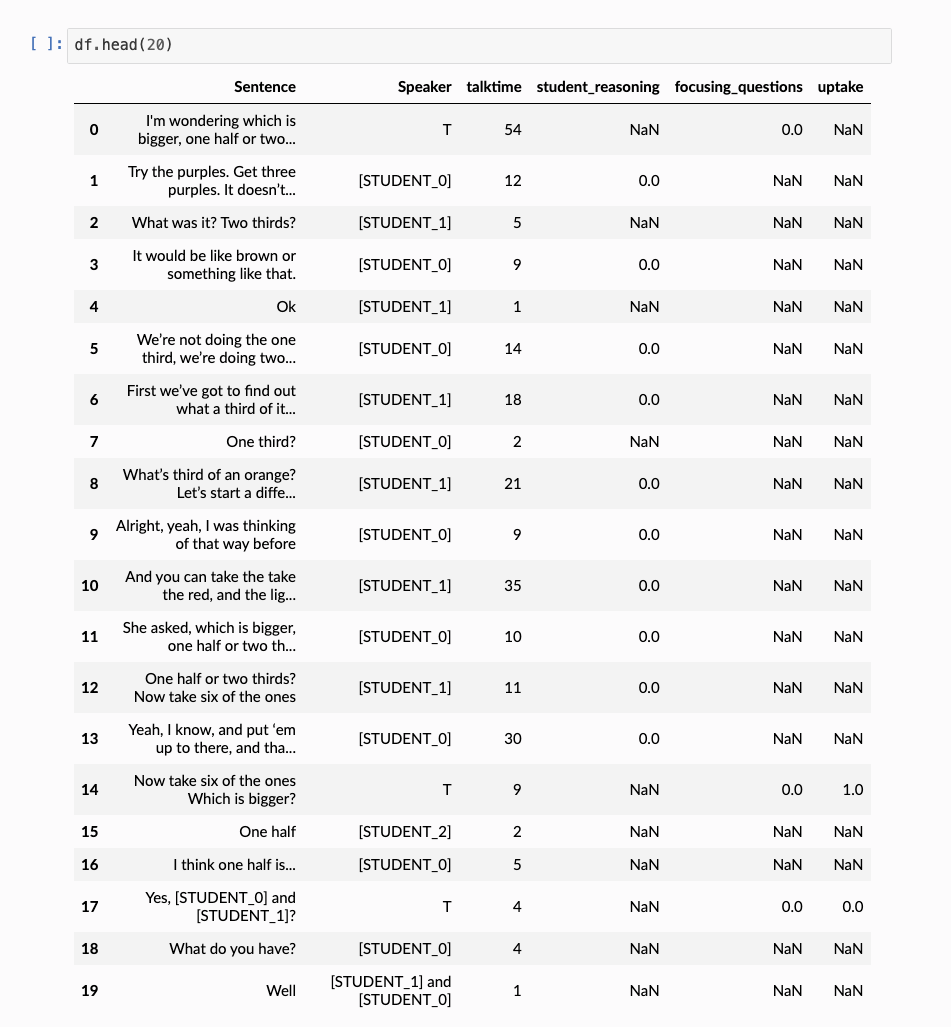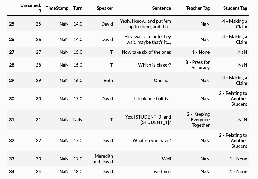 - The anonymized names are consistent: So [STUDENT_0] in the SPEAKER_COLUMN will refer to the same [STUDENT_0] in the TEXT_COLUMN.