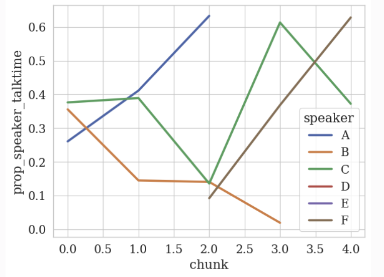 Let’s see how we can look at the talk time ratio (which we summarized before quantitatively) over time. This setup will look similar to the quantitative analysis however the key difference is that we will specify a num_bins argument to specify the number of bins we want to split the transcript into.