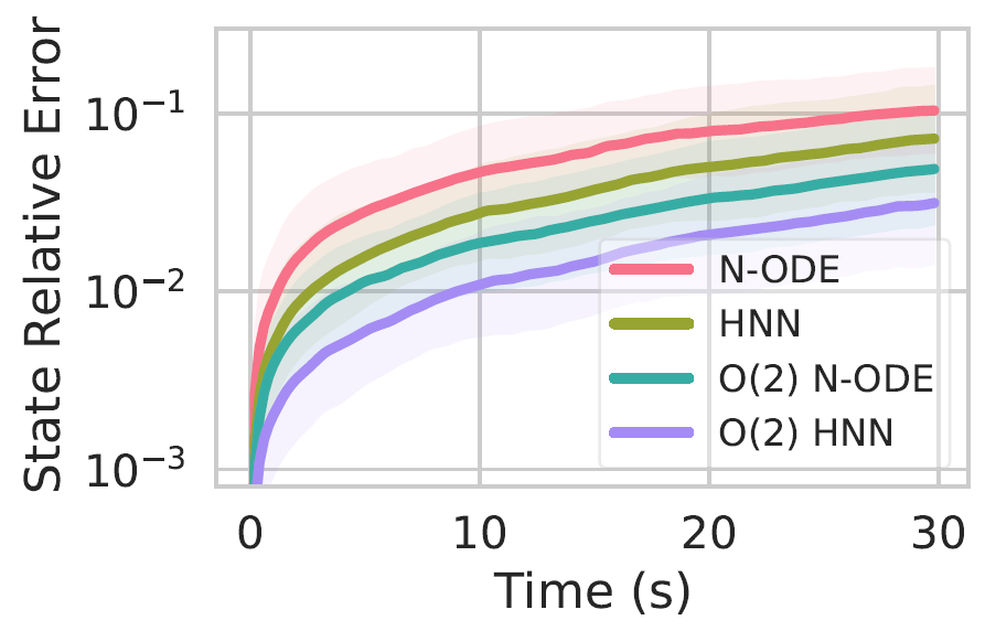 These models are trained to fit a double spring dynamical system. 30s rollouts of the dataset, along with rollout error on these trajectories, and conservation of angular momentum are shown below.