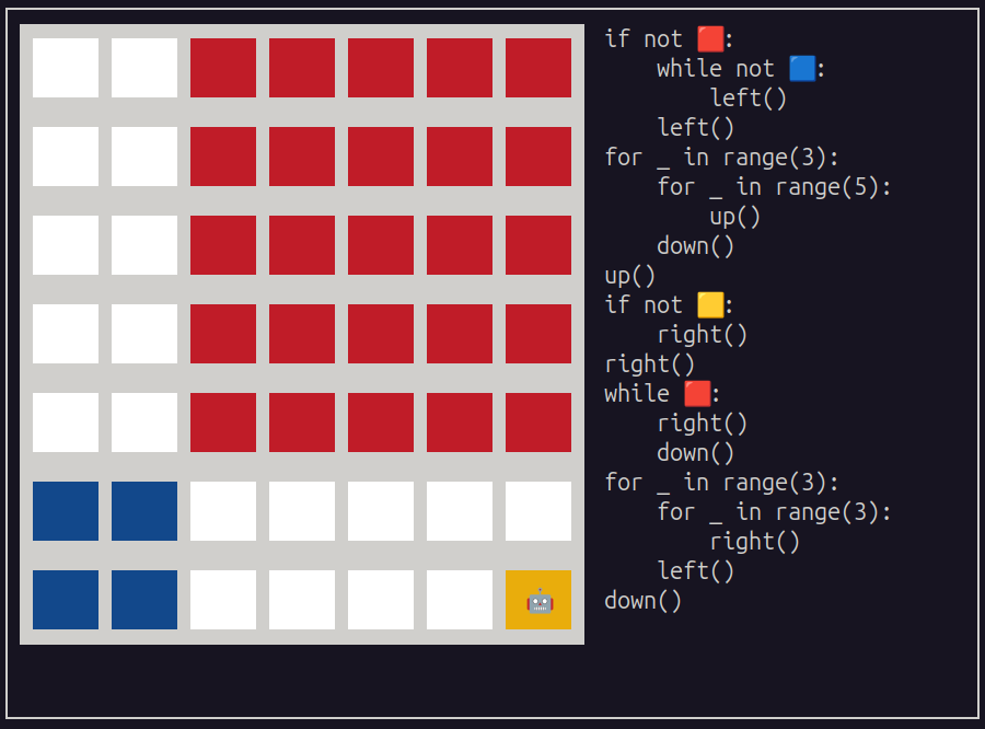 Execubotclass: takes(code, grid, row, col, lang)and runs the player's Python code viaexec()in a restricted namespace (only color-test functions and direction functions are exposed).extractor(): parses a.pyelevel file, splitting it at the first blank line — the header (above) isexec'd to extractgrid,row,col,lang, etc.; the body (below) becomescode.- Translations live in