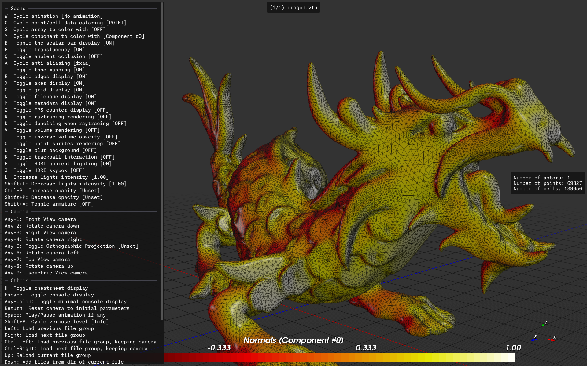 - Support many types of renderings (textures, edges, etc... ) and visualizations (meshes, volumic, point sprites)