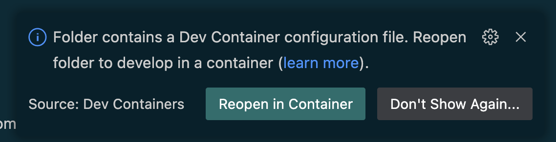 Once the project is opened, you will get the following option to reopen it in a devcontainer: