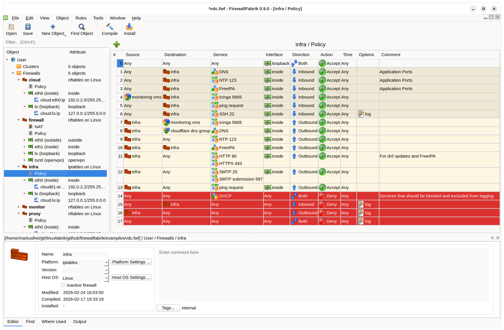 FirewallFabrik is a modern successor to Firewall Builder (fwbuilder), preserving its core design philosophy while updating it for current firewall technologies. It is a Qt-based GUI that manages firewall policies for multiple platforms, including iptables and nftables, from a single unified interface. All objects, rules, and device definitions are stored in a centralized policy database, allowing consistent reuse of services, networks, and rule sets. This architecture scales cleanly from a handful of devices to hundreds of firewalls, all managed from one policy file and one UI, with platform-specific configuration generated automatically.