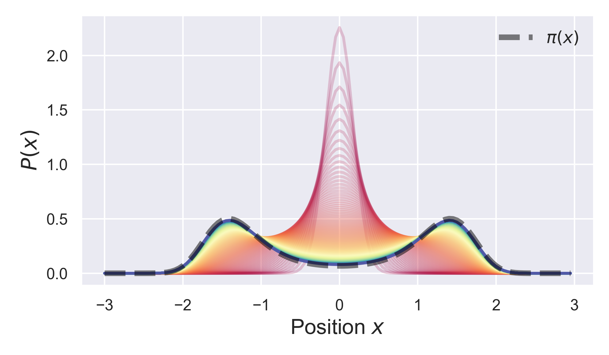Here, we can see the initial distribution converges towards the equilibrium distribution (black dashed line) over time.