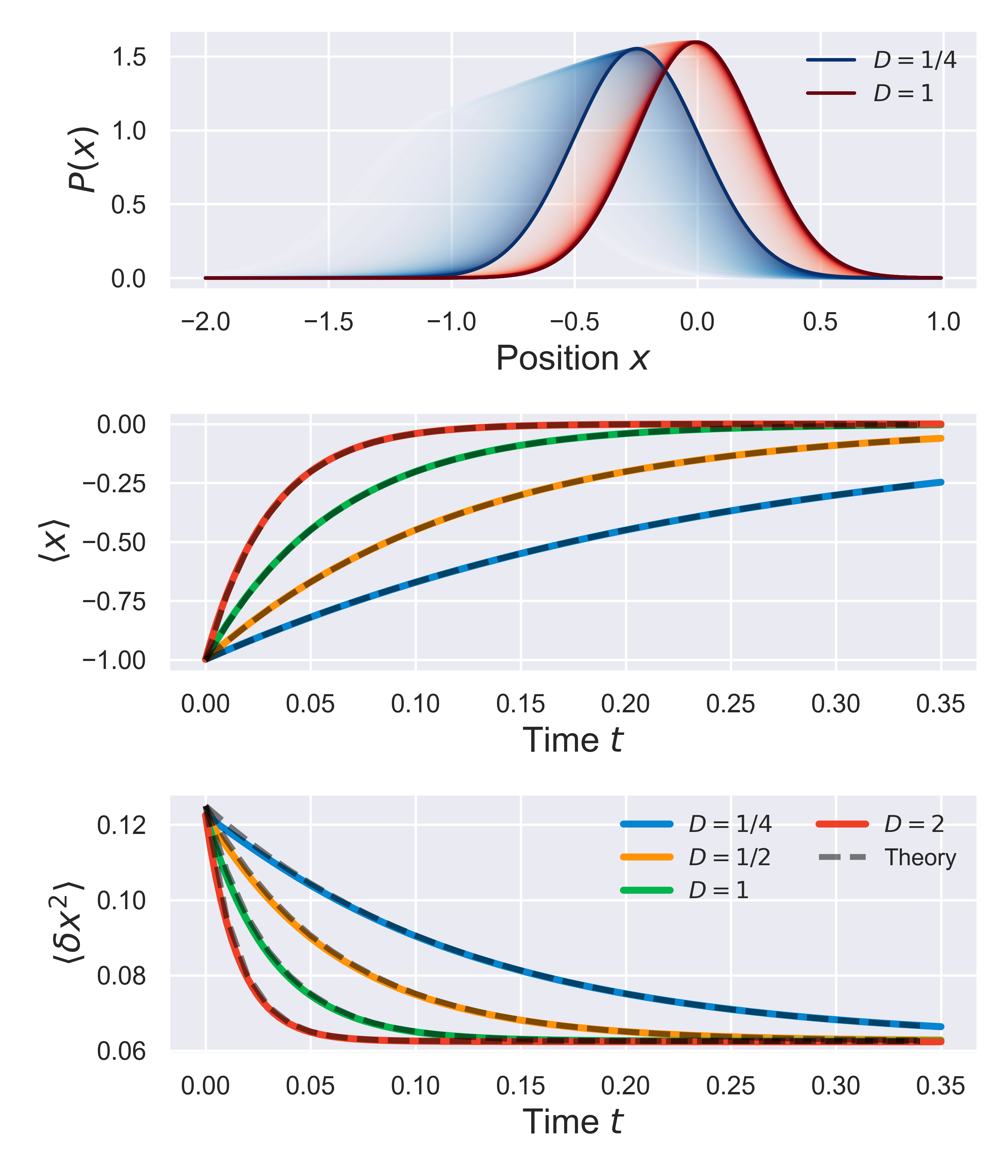 In fact, we can be even more quantitative about this. Following the procedure for this testing outlined in notebook notebooks/functionality.04-slarge-advection-diffusion.ipynb, we can also track the distribution variance and average position over time, and compare them to known analytical results. Specifically, for a stochastic system in a parabolic potential with trap strength $k_{\rm init}$, that is initially in a Gaussian distribution with mean position $\langle x\rangle = a$ and variance $\sigma_{\rm init}$, the time-dependent variance and mean should evolve according to