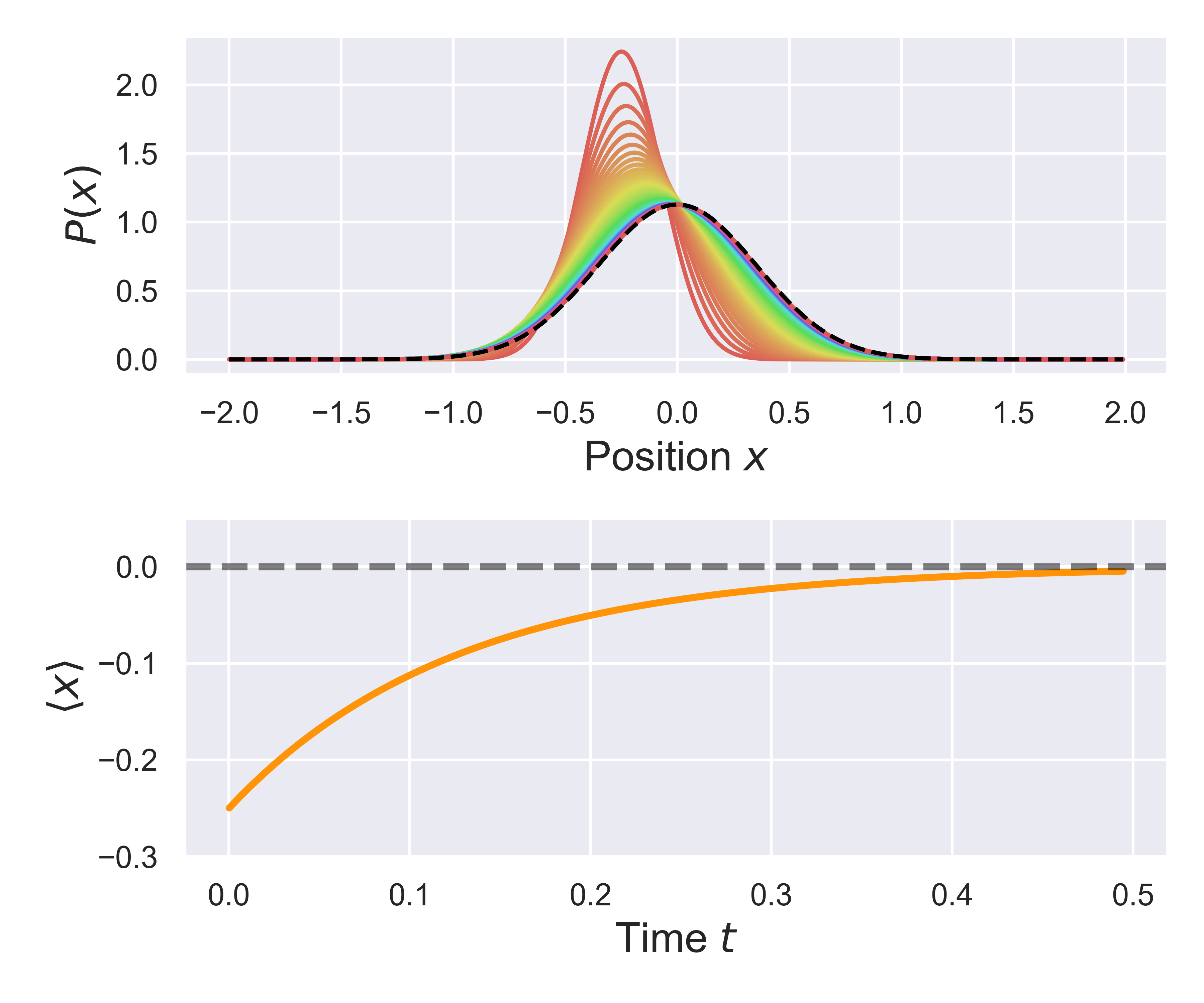 Based on the result of this simulation, we can plot the evolution of the probabiity over time, as well as the time-dependent position of the distribution mean. The figure below shows both of these things, and compares the distribution to its asymptotic (equilibrium) dstribution, as shown by the black dashed line.