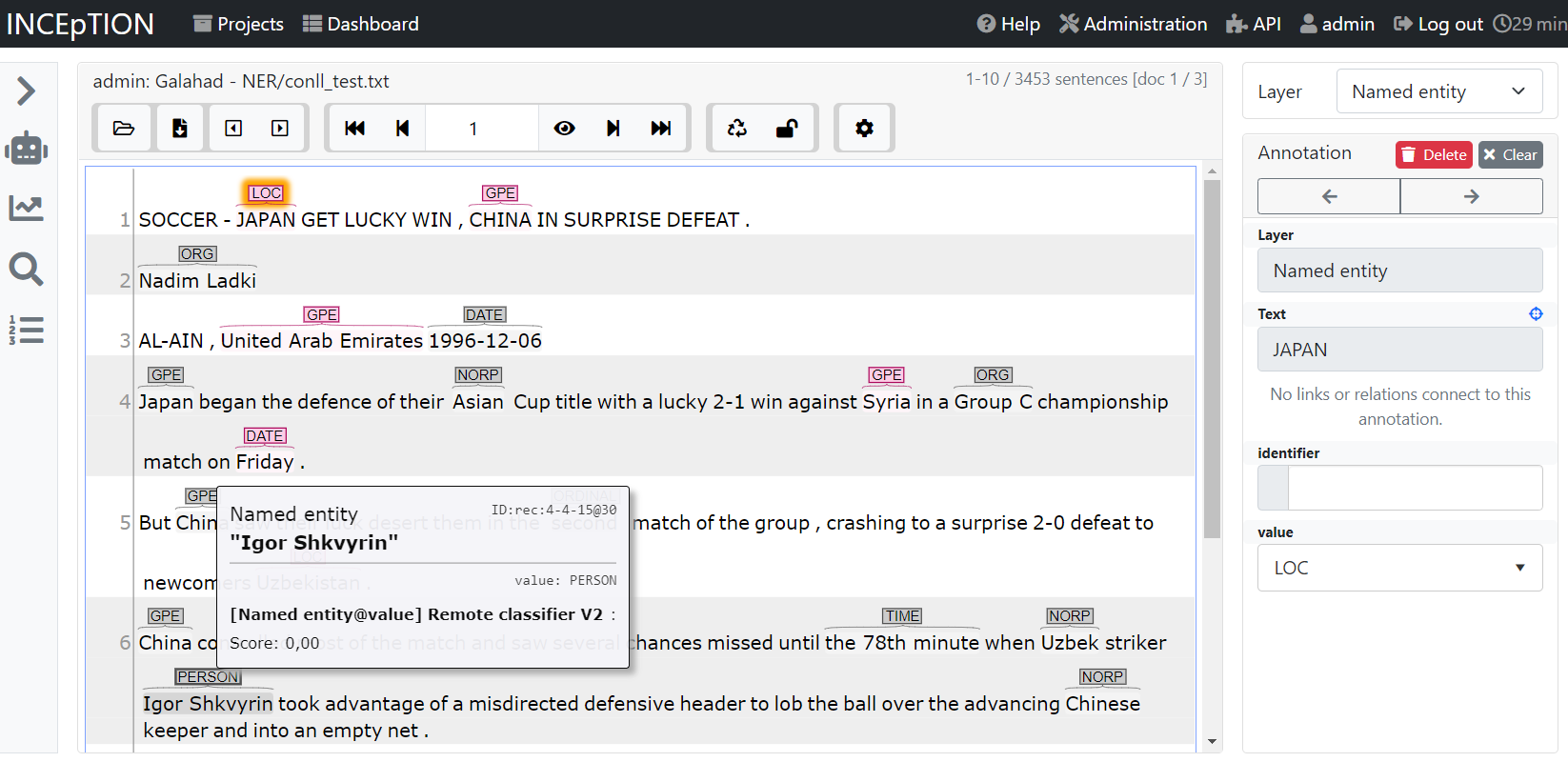 As an example, here we annotate named entities and use a pre-trained Spacy model. Gray are recommendations and red are real annotations. Annotators can accept, reject or ignore suggestions made by Galahad.