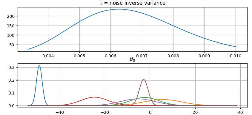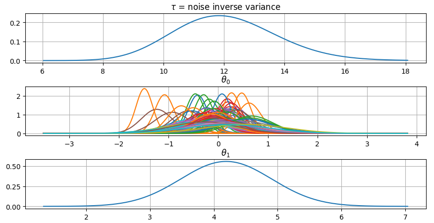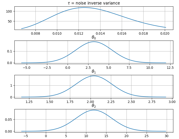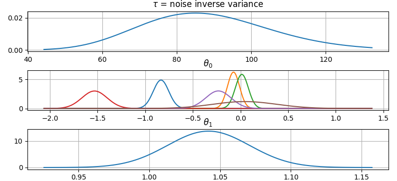 It is also possible to plot the estimated Γ-distribution of the noise precision (inverse variance) as well as the 1-D Normal distributions of each individual model parameter.