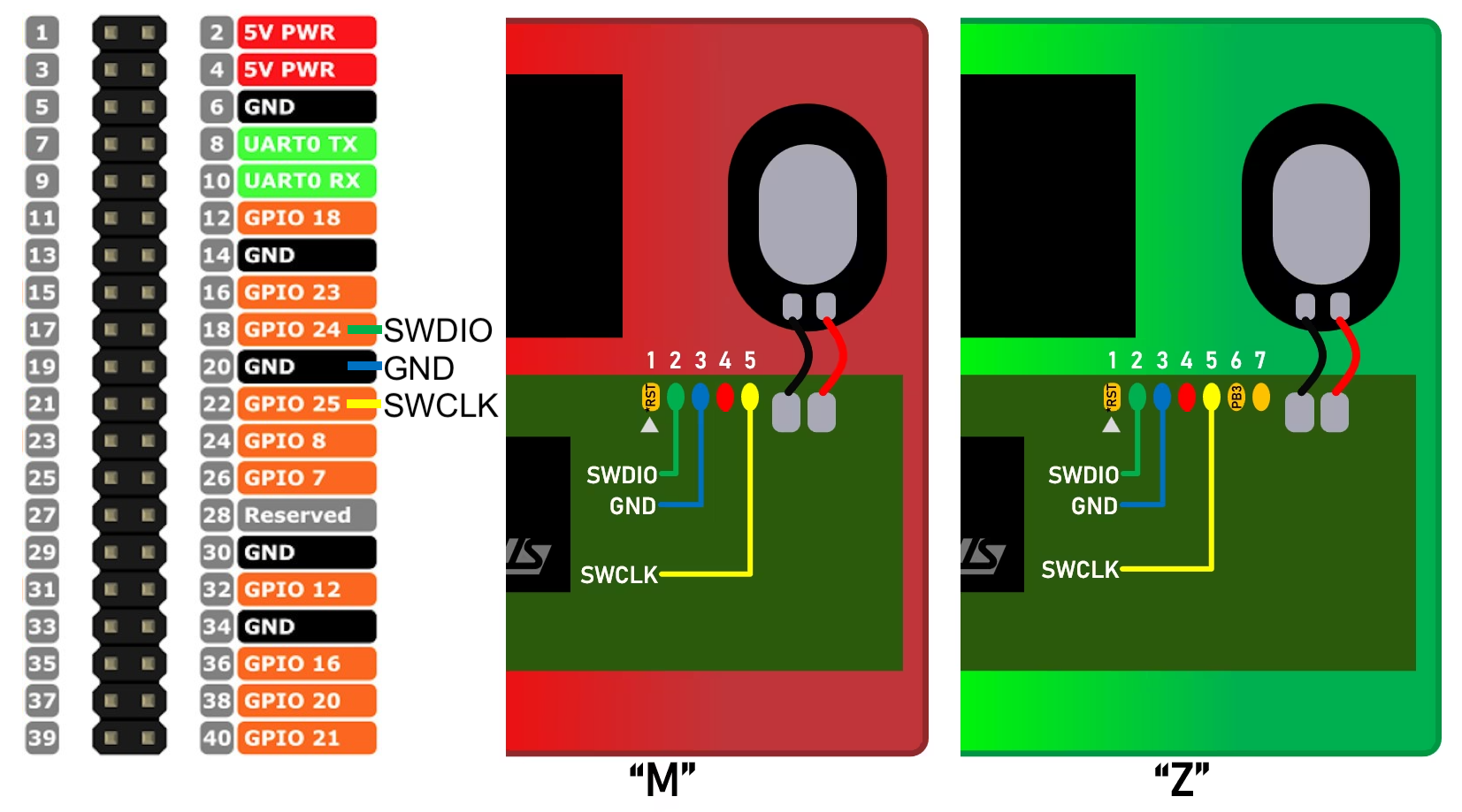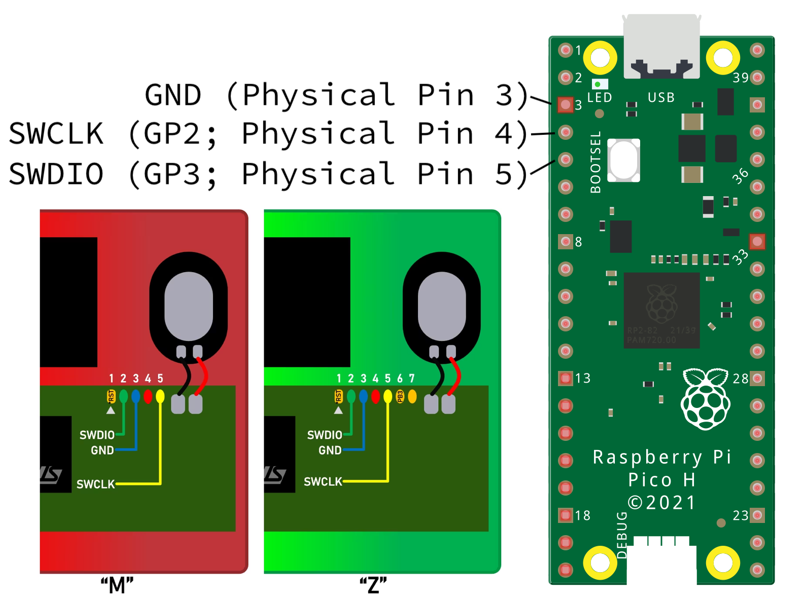 picoprobe.uf2to it. - Hook up the 3 wires (GND, GP2, GP3) to (GND, SDCLK, SWDIO), respectively.